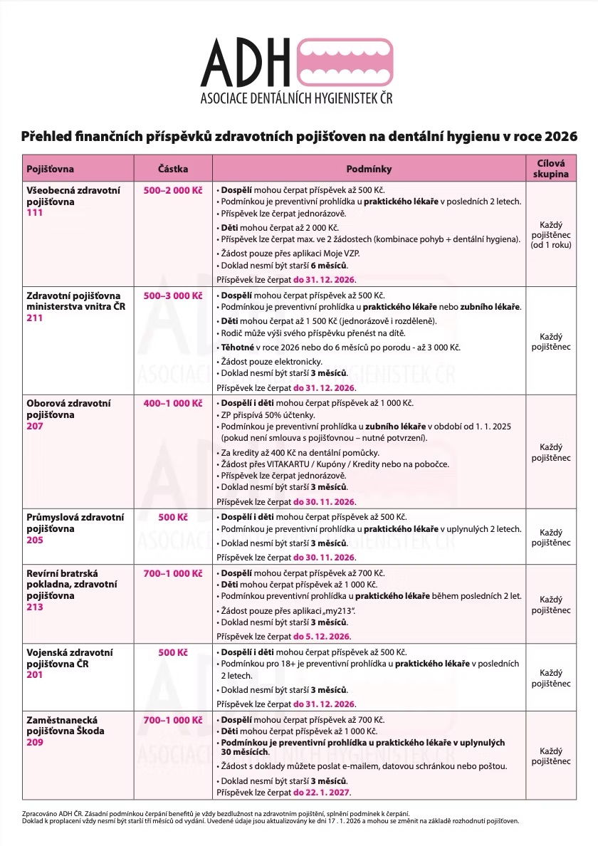 Asociace dentálních hygienistek ČR připravila přehled finančních příspěvků pojišťoven na dentální hygienu.